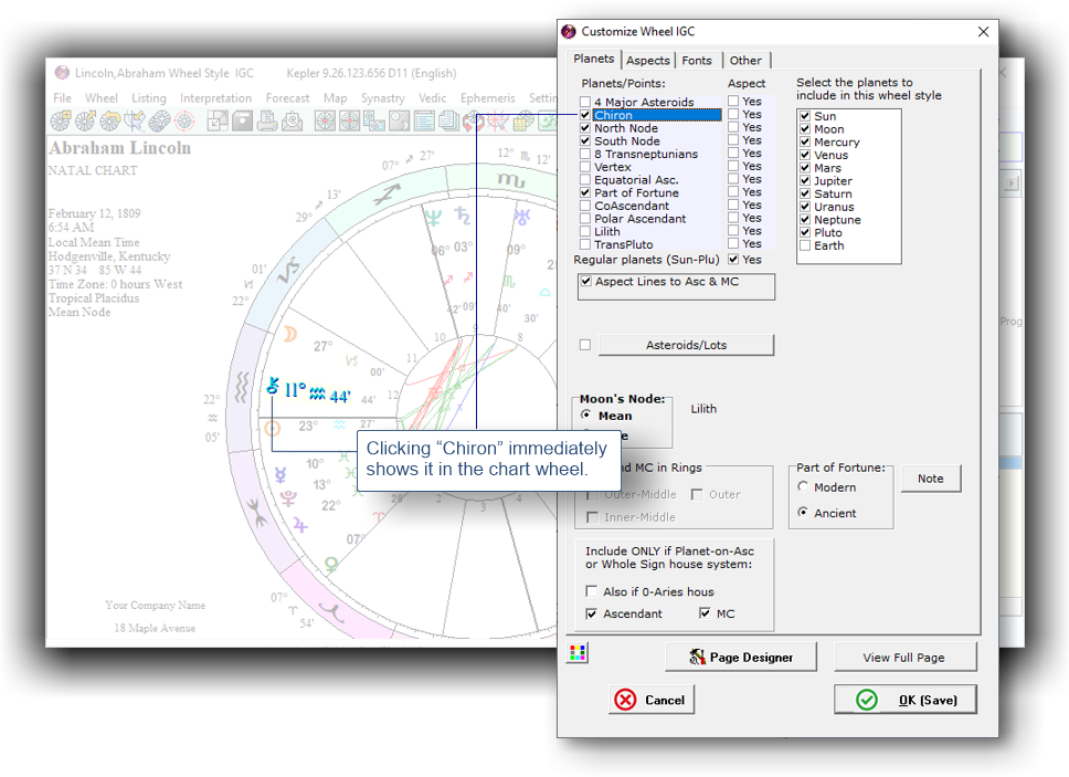 Most astrologers and students of astrology spend a lot of time looking at chart wheels. We often think of a chart wheel as something fixed and we can look at a chart wheel on the computer screen or we can print it out, and we have the same chart wheel. However, what if a chart wheel on the screen was interactive and flexible so you could click once to put Chiron in the wheel and click again to remove it? It would be nice if we could interact with the chart wheel so we could place an asteroid in the wheel to see where it is without having to place it in the wheel permanently. We might like to switch between the Mean Node and True Node, or between the ancient and modern formula for the Part of Fortune without having to make the selections, view the wheel, and then go back and customize the wheel again to set it back to the settings that you normally prefer. In Kepler you can do all of this! Browsing through the wheel styles is also fun because you see the actual chart wheel as you do this rather than a little thumbnail image of it. The Page Designer feature provides real drag-and-drop capability. If you are not familiar with computer lingo, that means you can visually move, add, and remove tables, aspect grids, etc. to a chart wheel. Even if you feel that you are not as good as the average child in your ability to use a computer, you will find that you can easily customize the chart wheel. For a more thorough introduction to selecting and customizing chart wheels in Sirius watch the 42-minute video. For even more information on customizing wheels, watch the 35-minute video on advanced customizing features. Also keep in mind that you do not need to watch these videos to understand how to select wheels and customize wheels. The procedure is intuitively obvious. The videos are available in case you want additional information and you will probably learn some nice "tricks" and features that you might otherwise overlook if you watch the videos. |