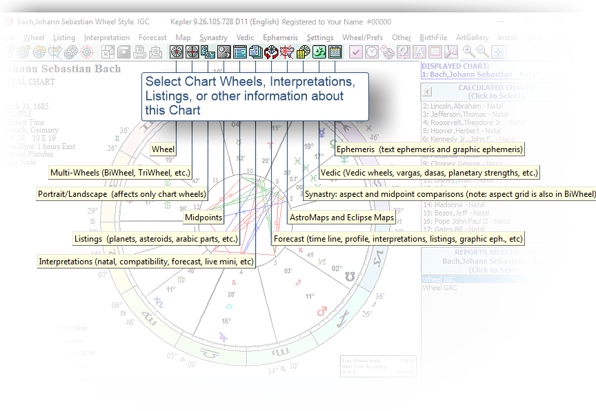 Kepler is an extraordinarily powerful program with and endless number of features. We have carefully crafted every part of the user interface to enable you to get the information you want in a smooth and intuitive manner. Many programs allow you to do the basics of pulling up a chart with ease. But suppose you want to do something creative like look at the midpoint structures formed between a solar return and a natal chart or a harmonic chart of a composite chart. Even if your approach to astrology is simple or you are a beginner, when the day comes when you want to explore a new idea or step outside the basics, you will be glad that you have Kepler. It all starts with the color-coded icons at the top of the main window. Click on the thumbnails for full screen shotBlue Icons: Make a new chart. A progression, solar return, composite chart, relocated chart, and harmonic chart, for example, give you a new set of planetary positions. Make new charts with the blue icons. Green Icons: Select chart wheels, interpretations, listings. Here you select whatever information you want about this chart, whether it is a wheel, interpretation, table, listing, etc.