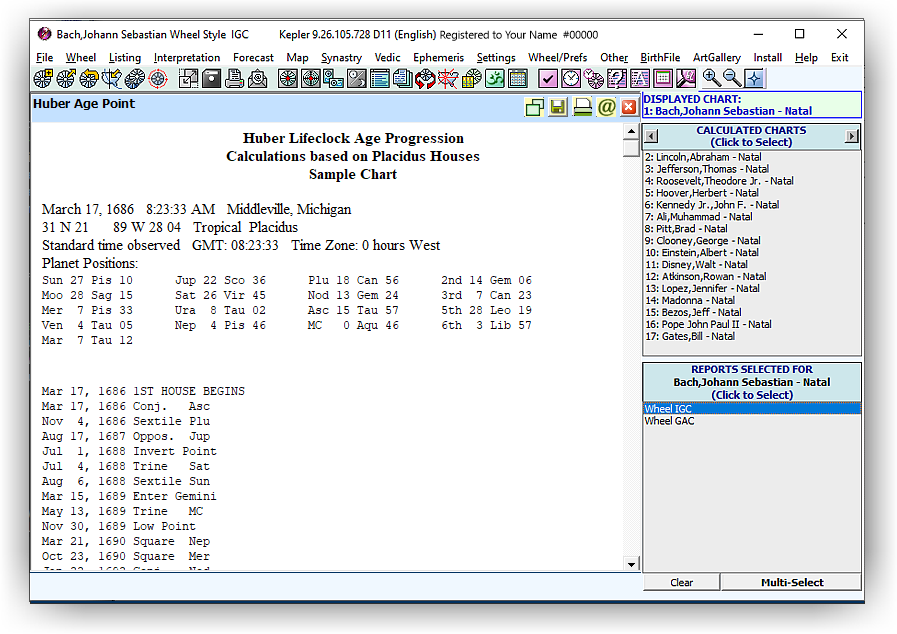 What is the Huber Age Point method? The Huber Age Point method is a way astrologers link your age to different parts of your birth chart to understand what life themes are active at different times in your life. Think of your birth chart like a map of your life. The Age Point shows where you are on that map at a certain age. This feature creates a Huber Lifeclock Age Progression Listings.