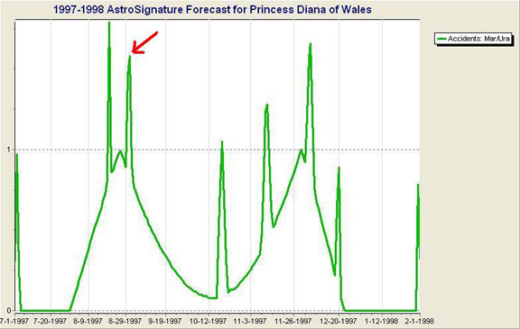 Using the Kepler 7 software, I entered this AstroSignature into the program. I then decided to look at the car accident on August 31, 1997 in which Princess Diana died. I looked at a graph for 3 years from the previous year to the following year, i.e. 1996, 1997, and 1998. The graph is shown below: ![]() Although I produced this graph with the expectation that the graph might indicate August 31, 1997 as important, I was surprised to see the extraordinarily precise indication of the date. I added a red arrow to the graph to show the late August of 1997 time period. The graph is nearest its highest point in this time period. I then produced the graph for about a half year around the time in which the accident occurs. Shown below is this graph, which is for the time period July 1, 2007 to February 1, 2008: ![]() Again, I added a red arrow to point to the date of the accident. We can see that August 31, 1997 is one of the highest peaks, and from the previous graph, we see that this peak is also one of the highest peaks over a 3-year time period. Below is the graph from mid August to mid September showing that the peak pointed to in the above graph is precisely August 31. ![]() I then decided to look at one other famous catastrophic well-known event: the assassination of John Lennon on December 8, 1980. Shown below is the graph for John Lennon for 1980: ![]() Again, I have added a red arrow to the graph to show the date of the assassination. Although not quite as dramatic as the graph for Princess Diana, again one of the highest peaks during the time period points precisely to the date of the tragic day. The software also shows the astrological influences in effect on these tragic days. The information displayed in the software is shown below: Aug 31, 1997 Tran-to-Natal For John Lennon the results are: Dec 8, 1980 Tran-to-Natal In other words, on the date of Princess Diana's fatal car accident, the influences were transiting Mars conjunct natal Saturn/Uranus midpoint with an orb of 15' and transiting Uranus opposition Sun/Mars midpoint with an orb of 10'. For the date of John Lennon's assassination transiting Mars/Saturn midpoint is opposition natal Uranus with an 8' orb. These orbs are approximate because they are not calculated for the precise time of the accident. With the Sirius software we can also view influences across a single day and of course the calculations can also simply be done for the exact time of the events. However, this is not necessary at this stage of the research because the exact orbs will not change greatly and the basic hypothesis is supported. We could now look at dates of other famous accidents and assassinations as well as dates of major accidents of anyone who has a recorded time of birth and the date of a major accident. There are many questions and issues that arise, as there is with any research. In this research, we could investigate different kinds of accidents, test other astrological influences, etc. This research study opens up a possibly very fruitful avenue for further research. Although this research provides very promising results, I have not yet continued this research further. I am engaged in many avenues of study and research in astrology, and have not yet been able to continue following this possibility. I am presenting this research study because it may be helpful to other researchers. The use of quantitative methods and visual tools for seeing results on a study of extreme events is a methodology that appears to be appropriate for research into astrological forecasting. Also, I wish to add that these two cases of Princess Diana and John Lennon are, thus far, the only cases that I have studied. Researchers have a responsibility to accurately and thoroughly present their methodology. Although this is a short article, it does present all relevant information for appreciating the nature of the study. This research was conducted in 1996 and was inspired by the need to develop a research topic for a lecture. The lecture was presented at the 2006 Balkan Astrology Conference in Belgrade, Serbia and received a very enthusiastic response. In the future a more concentrated and sustained effort to pursue this line of research could possibly produce replicable statistically significant results. With a study of only two cases, it is far too early to be very optimistic in this regards, but the methodology and variables studied do show some promise. In short, the final conclusion of this study is that the need for further research is very strongly indicated.