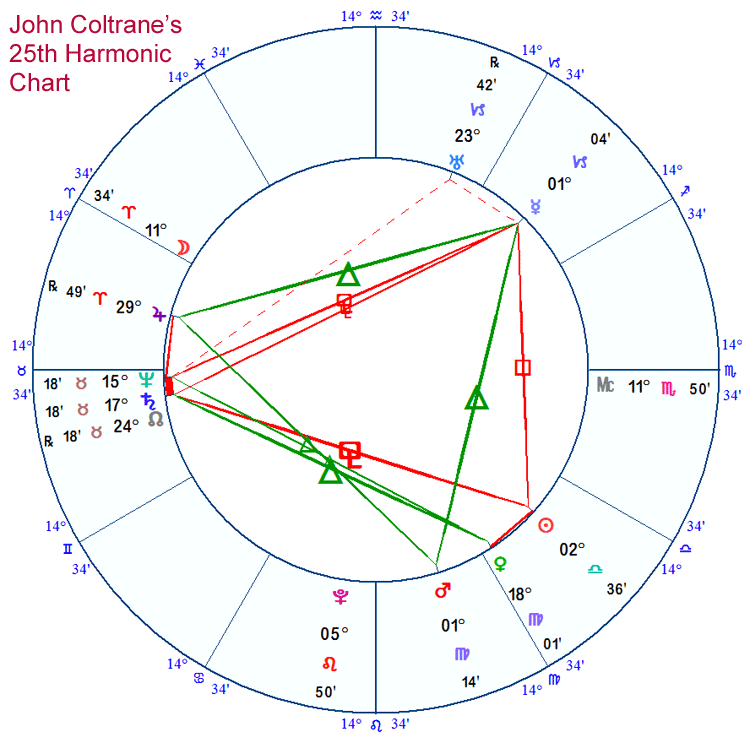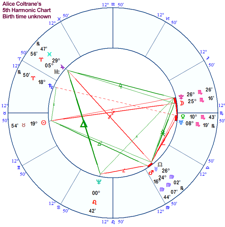 Recently I've been listening to Alice Coltrane and jokingly thinking to myself that she might be a bigger genius than her husband. But that is a bit like comparing Einstein, Neils Bohr, Kepler, and Newton; take your pick. Not having a birth time, I just entered 12 noon and looked at Mercury, Mars, and Jupiter, thinking that they might be in a 5th harmonic or 25th harmonic pattern but a birth time would be needed to confirm a 25th harmonic. My reasoning is that they might have truly been made for each other.