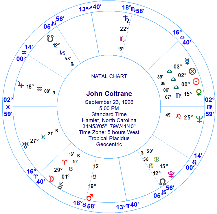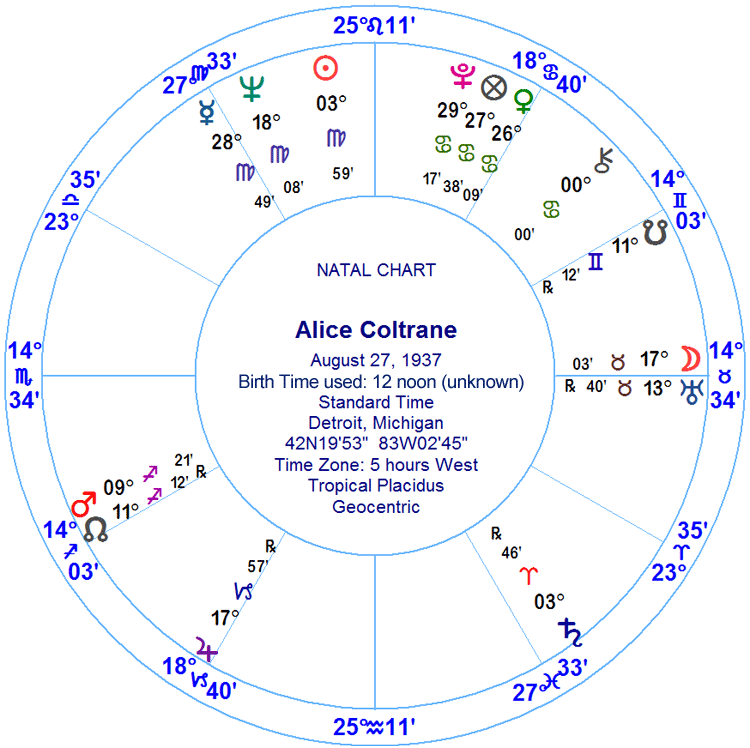 Alice periodically performed late in her life using her married name of Alice Coltrane. That tells me how deep her love and appreciation of her husband was; a lady of that level of intelligence and sensitivity is not likely to do anything without some deep thought and consideration, in addition to the minor fact that they were married. Alice's Mercury is quintile Mars, tridecile Jupiter, and Mercury at 12 noon is tightly square the Mars/Jupiter midpoint. The configuration was in effect for that day. This configuration is one that I have mentioned in lectures many times. It is a special configuration but it won't necessarily make an Alice Coltrane. It is almost guaranteed to give superlative creative intelligence, however. Alice did grow up in a family that provided her the tools to grow and develop. Of course, without a birth time we are unable to analyze planetary configurations at the time of Alice's birth in any detail. I read that the Coltranes are bured in Pinelawn cemetery in Farmingdale, New York. In the unlikely event that I am ever in the area, I'll put a flower on both graves and wish them well. Namaste my brilliant friends. Many thanks for the music and the inspiration. Finally, note that the above analysis is based on sophisticated mathematical models that I have developed for astrological analysis. The form of astrological analysis that I employ is almost unique, and unlike most astrologers, I remain skeptical of all astrological models including my own because they are yet to be confirmed through research and if correct, the models, in m opinion, can be validated. Most astrologers, however, have a very different philosophical and epistemological perspective on how astrology can be known and improved.