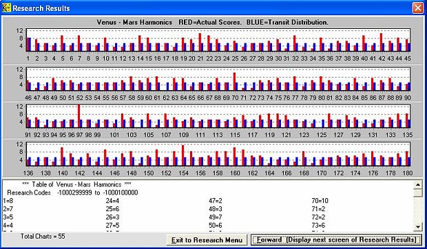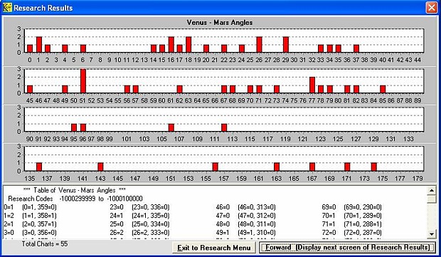Copyright © 2007 All Rights Reserved by David Cochrane WHAT EXPLORATORY RESEARCH AND ASSUMPTIONLESS RESEARCH ARE AND WHY THEY ARE IMPORTANT:Exploratory research is research designed to reveal what astrological influences occur in a particular set of charts. Exploratory research is extremely powerful is one of the most important research tools available to astrologers. Unfortunately this method is not utilized as extensively as it should be. Hopefully, this paper will inspire astrologers to use the powerful exploratory research tools that are available in order to develop hypotheses that have promise of being validated in a research study. At this point in time there is no completely convincing replicated research studies in astrology that have validated any astrological hypothesis. There are varying opinions among astrologers as to whether astrological research will ever validate astrological theory, and astrological research is a difficult and painstaking undertaking. I believe that any hope of validating astrological principles in research is likely to involve considerable exploratory research before an actual research study that validates astrology and can be replicated is developed. In this article I describe how exploratory research can be conducted, and the results obtained on painters, scientists, musicians, and actors in the Gauquelin database. The exploratory research conducted was successful in isolating a group of related astrological factors that occurred in these charts, and these factors are consistent with astrological theory. Note that discovering astrological influences in a set of charts is not a scientific validation of astrology. The findings of exploratory research can be used to make a hypothesis that can be tested in a research study. The data used in the research study must, of course, be different from the data used in the exploratory research. Assumptionless research is a kind of exploratory research where very few assumptions are made at the outset as to what kind of influences may exist in charts. For example, in the research described below the assumption is that angular distances between planets may be important and that aspects can be grouped together as having a similar influence if they share the same denominator (such as the 1/8 (semisquare) and 3/8 (sesquiquadrate) aspets). No other a priori assumption as to what is expected is employed until the results of the assumptionless research are gathered and summarized and ready to be evaluated. EXPLORATORY RESEARCH OF ASPECTS:The most commonly used astrological influences are aspects, zodiac sign placements, and house placements. Rulerships, exaltations, and other ways of relating these influences to each other are also often used. Combinations of planets in midpoint structures, and other ways of looking at how astronomical phenomena correlate with behavior on earth are also utilized by astrologers. In the study below I have focused on aspects between the planets. The Kepler 7.0 program was used to do this study: For 55 charts of painters in the Kepler database I selected a distribution of angles between Venus and Mars, as shown below.