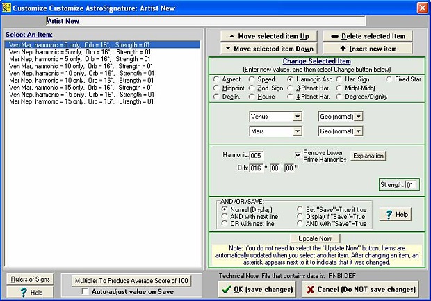 LIST OF HARMONICS:Shown below is a list of all harmonics that occurred more than 10% more than would be expected by average. An average score that is 10% above the expected average score for 1,528 painters is 149 (149.4), for 1,294 musicians is 127 (126.52), for 1,458 actors is 143 (142.56), and for 3,646 scientists is 357 (356.51). I looked at harmonics up to 45. The number 45 is somewhat arbitrary and happens to be how many harmonics appear on one line of the graphic report that I was looking at. In a few cases the control group values were not evenly distributed, most notably the first harmonic for some planetary pairs occurred frequently by chance, and harmonics for Jupiter-Saturn, a slow moving pair, were not as evenly distributed as other planetary pairs. The harmonics that occurred at least 10% more than would be expected by chance are: Scientists Painters Musicians Actors