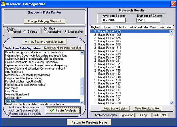 In my research I look for minimum differences in average scores of at least 10% when large numbers of charts are involved. The fewer the number of charts studied, the wider the fluctuation in average scores can be. In this case, there are over 1,000 painter and over 1,000 scientists in the data so a minimum difference of only 10% is of interest. Keep in mind that the Gauquelin effect for the diurnal placement of planets is one of the most powerful supports for the validity of astrology and the magnitude of the effect is very small. We do not need huge effects to have a finding that is potentially very powerful. A statistical analysis however using a T test shows that the scores for the Gauquelin painters and Gauquelin scientists is not statistically significant at the 0.05 level. CONSISTENCY OF RESULTS:Consistency of Results and Agreement with Astrological Theory In my own astrological work, if I see 5th harmonic aspects between Venus, Mars, and Neptune, I expect artistic talent and inclination. Therefore, the study is based on ideas that agree with astrological concepts (at least the concepts that I use, although not necessarily that of other astrologers). Because the 5th, 10th, and 15th harmonics are regarded as similar according to harmonic theory and all of these harmonics are used between 3 planets, a consistent application of harmonic theory has been used. I used 16 degree orbs (in the harmonic chart, which in actuality is an orb of 16 divided by the harmonic, or slightly over 1 1/2 degrees, for example, for the 10th harmonic, i.e. 16 divided by 10. DISCOVERY:A Remarkable