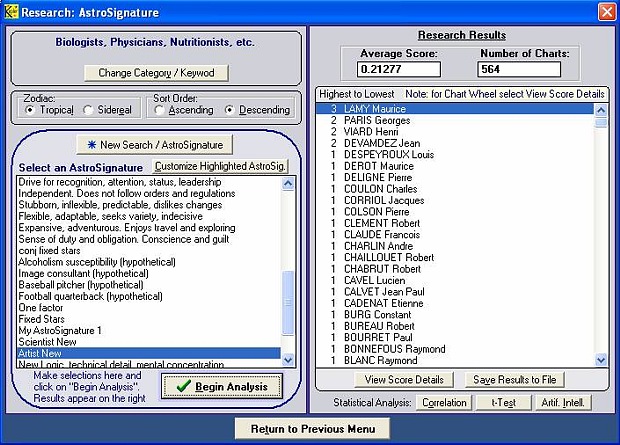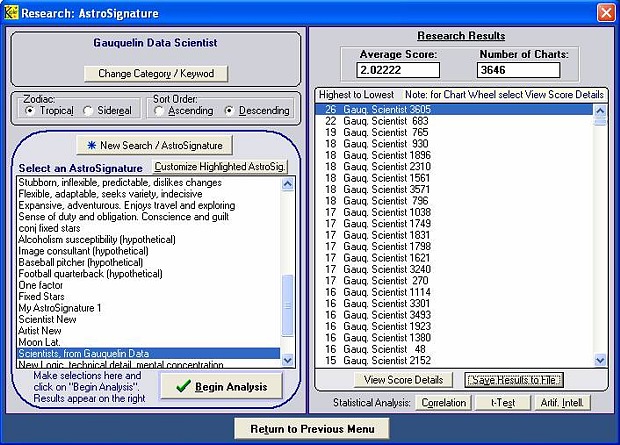 Exploratory research is a small, but important, progressive step from anecdotal evidence. Most problems of selective perception, complexities of extraneous variables and complexities such as how we attract certain people, are mostly eliminated. However, we must still be cautious and realize that random fluctuations can occur, and I am not yet ready to draw more definitive conclusions regarding the 17th harmonic, and I am not as confident that the 17th harmonic aspects will appear more often in another group of actors. I am more confident about the other conclusions because previous pilots studies and anecdotal evidence more strongly support the results found. Exploratory research, like anecdotal evidence, involves subjective evaluations and assessments that are not always based on clearly measurable results, and the conclusions I have drawn are largely influenced by subjective evaluations based on previous anecdotal evidence as well as the results of this research. Further Refinement of Astrological Theory Can Require a Massive Database I think that the vast majority of astrologers would agree with me that the influences in the astology chart operate through the interaction and integration of a great many factors. The complex ways in which our environement and our decisions weave the tapestry of our lives, in combination with the impact of the astrological influences, is very difficult to break down into simple testable statements. In the research described above, combinations of two planets are used. This is very simplistic compared to reading the story written in the astrology chart. We can only find very modest correlations using databases of a few thousand people. With databases of tens of thousands or hundreds of thousands of charts it could be possible to look at, for example, harmonic patterns of 3 planets, or other kinds of combinations of 3 or more factors, or other ways in which a combination of astrological influences can combine together to create an inclination towards a particular vocation, other behavior, or trait. EVALUATION RESULTS:Evaluating and Testing the Hypothetical AstroSignatures Dervied From Exploratory Research Science AstroSignature for Scientists: The results of the Science AstroSignature for Scientists is shown below.