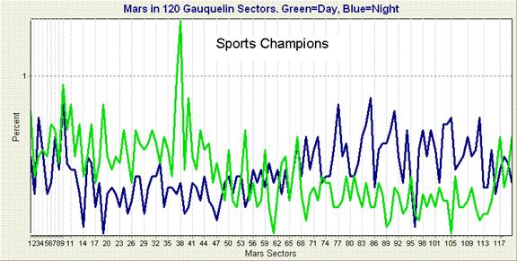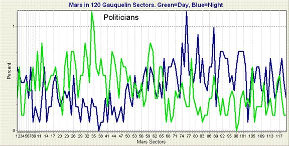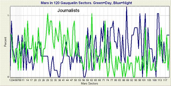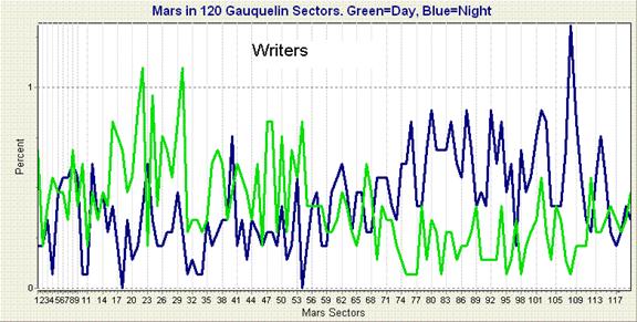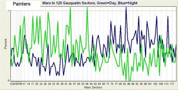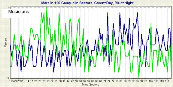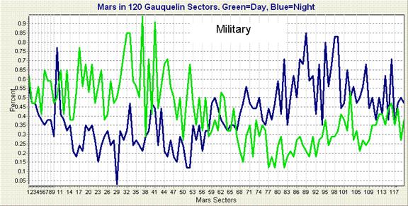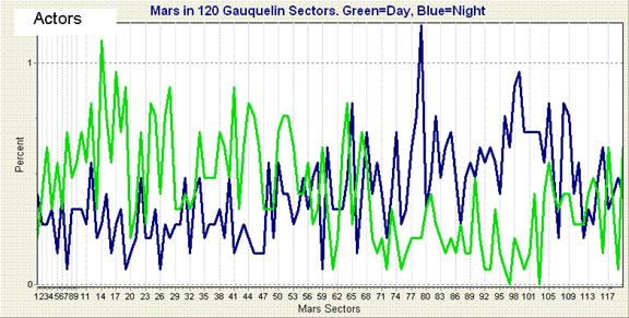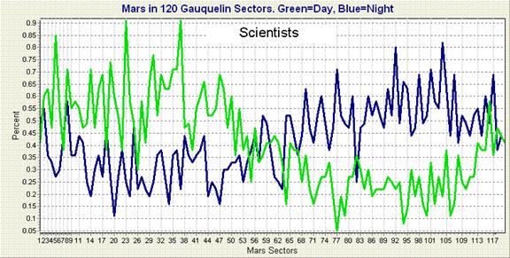 Distribution of Mars in Gauquelin Sectors for Day Charts and Night Charts of Professional Groups Copyright © 2010 All Rights Reserved by David Cochrane In a recent paper I reanalyzed Theodor Landscheidt's findings regarding the distribution of Mars-Saturn angles in the birth charts of scientists as presented by Landscheidt in the May-June, 1998 issue (Vol 40, # 3) of the Astrological Journal published by the Astrological Association of Great Britain (see A Reanalysis of Theodor Landscheidt's Findings). Landscheidt analyzes Mars-Saturn angles and also the distribution of Mars in Gauquelin sectors. In the previous paper a reanalysis of the distribution of Mars-Saturn angles was conducted. In this paper a reanalysis of the distribution of Mars in Gauquelin sectors is conducted. Landscheidt's analysis of Mars in Gauquelin sectors builds upon earlier work by Lee Lehman. Lehman introduced an innovative approach to analyzing Mars in Gauquelin sectors: she distringuish day charts from night charts and analyzed them separately. A day chart is a birth chart during the day, i.e., the Sun is above the horizon, and a night chart is a chart that has the Sun below the horizon. In ancient western astrology day charts and night charts are regarded as being different from each other. Lehman applied this day to the analysis of Gauquelin sectors and Landscheidt reanalyzed Lehman's findings to point out peaks at golden aspects. Landscheidt notes that Lehman produced 12 Gauquelin sectors and he would like to see a finer division into 36 sectors. In the graphing of the data below the results are shown in 120 sectors so that a very detailed look at the distribution of Mars is possible. Landscheidt's graphs of Mars in Gauquelin sectors for professional groups includes arrows pointing to the peaks and a designation of the golden aspect involved. I have assembled the data in these graphs into the following summary of conclusions presented by Landscheidt regarding where peaks in the Gauquelin sectors occur. Data Summary 1.
