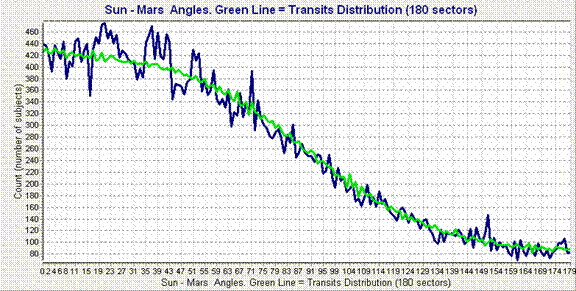 Note that the numbers in parentheses are moderate highs and lows. For example, painters and musicians have a moderate high at 137.5 and a more pronounced high at 68.8. The results presented in the graphs of sports champions and actors in Landscheidt's paper brought to mind that I had neglected to analyze these professional groups in the previous paper (A Reanalysis of Theodor Landscheidt's Findings). In the previous paper I analyzed six professional groups: scientists, musicians, journalists, politicians, military leaders, and painters. There are three additional professional groups available in the Sirius software that I neglected to analyze: sports champions, writers, and actors. I plan to go back to the previous article and add the analysis for these three additional professional groups. The results for nine professional groups are shown below. The distribution of Sun-Mars angles in 46,257 charts of famous people, companies, and major events and the distribution of Sun-Mars angles daily from 1800 to 1930 is shown in Figure 1. This graph shows that the Sun and Mars are more likely to be near each other than opposite each other in the sky. In fact, the likelihood of Sun and Mars being conjunct is over four times more likely than the likelihood of being opposition. ![]() The blue line is the distribution for 46,257 charts of people, companies, and events. Very interestingly the relatively smooth green line as compare to the blue line in this graph reveals more fluctuation in Sun-Mars angles for the charts of people than in the daily distribution even though the number of charts of people and the number of daily charts in the random distribution is about the same. Because the charts of people, companies, and events covers a very wide range of phenomena, we can guess that this greater variability in the distribution of Sun-Mars angles in these charts is due to a greater number of scores in certain years or seasons. Because this issue is not the primary concern of this paper, we will not pursue this issue further. The main point in regards to the current study is that there is greater tendency for Sun to be near Mars than to be far from Mars. In the graphs shown in Figure 2 the distribution of Mars in 120 Gauquelin sectors is given, and the sectors are numbered 1 to 120. By dividing the angles given by Landscheidt by three we obtain the equivalent sector number in the graphs below. The peaks identified by Landsheidt and given earlier in this paper are divided by three to show the equivalent sector number in Data Summary 2 below. Data Summary 2.