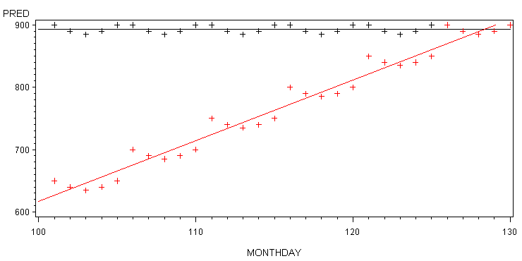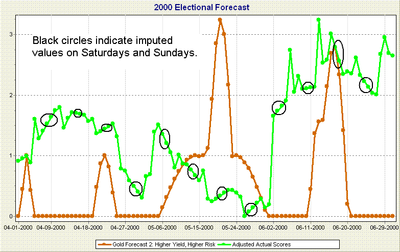 To summarize, the detection of short-term effects of extraneous time-varying covariates over time series data over a relatively long period of time is overwhelmed by strong long-term trends in the data. The strong long-term trend in the data in Figure 2 is the positive trend upwards over time. Although the data in Figure 2 is idealized in order to illustrate the point, the same principles are in effect in the analysis of the astrological variables used in the gold forecast.