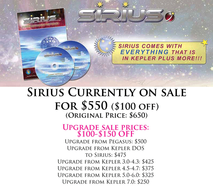 The sale continues! Sirius regular price is$650, on sale for $550. Many of our customers also requested that we extend the sale on upgrade prices to Sirius. Please see details below. ![]() OTHER ITEMS ON SALE: JULY 15 THROUGH AUGUST 31, 201315% Off All Interpretation Report Options with the exception of 4 reports: Indra, Cayce Past Life, MedScan, and Medical Forecast! Our regular report options discount is 10% off for purchases of $650 or more of report options. During this sale, an additional 15% discount will be deducted for a total of 25% discount for a purchase of $650 or more of report options. There are dozens of Interpretation Reports listed at https://astrosoftware.com//cgi-bin2/order.cgi under the headings "General Natal Reports", "Specialized Reports", "Compatibility Reports", "Forecast Reports", "Relocation Reports", "Health Reports" and even the products listed under "Other" are on sale for 15% off. The only products that are not on sale are Kepler and Pegasus. TO PURCHASE THESE PROGRAMS THAT ARE ON SALE,