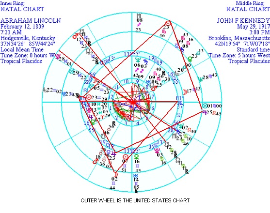 In looking at this event, my curiosity prompted me to do a little research into the first U.S. presidential assassination, that of President Lincoln, and I found some fascinating correlations between the two. Abraham Lincoln was born on February 12, 1809 at 7:20 AM in Hodgenville, Kentucky. ![]() Isn't it ironic that Lincoln's natal Sun at 23 Aquarius 29 conjoined Kennedy's Uranus? And of course, this went on to square the U.S. Sun at 23 Scorpio46 as well. Lincoln's 12th house cusp was at 28 Capricorn 56 which conjoined the natal U.S. Pluto at that degree. and Lincoln's natal Pluto was at 13 Pisces 37, the same placement that the progressed U.S. Moon was when Kennedy was shot. Furthermore, when Kennedy was shot, the progressed U.S. Mars (gunshots) was at 3 Gemini 23, and Lincoln's natal Saturn at 3 Sagittarius 09 opposed that. Saturn brings things back from the past, so could this be a clue to what happened to Kennedy was a repeated event? ![]() Lincoln was shot on the night of April 14, 1864. In the progressed U.S. chart for that date the Sun was at 21 Aquarius 35 and opposing retrograde Jupiter at 21 Leo 57. And going back to the chart for Dallas for the actual time of the Kennedy shooting, which I feel was at 12:36 P.M., the ascendant would have been 21 Aquarius 35; that same degree The Civil War started officially on April 12, 1861, although the first hostile shot of the war was fired by the Confederates on January 9, 1861. On that January date, transiting Uranus was retrograde at 8 degrees and 32 minutes of Gemini conjunct the 4th house cusp of the U.S. natal chart. The progressed U.S. chart for April 12, 1861, the official date of the beginning of the war, is fascinating. In it, the Midheaven is 2 degrees and 52 minutes of Pisces, which squares the U.S. natal Moon at 2 degrees and 45 minutes of Gemini. This went on to form a T-square when you add the progressed 4th house cusp to the aspect at 2 degrees and 52 minutes of Virgo. The duality of the Gemini Moon manifested in our nation, as it officially split into two countries for four years, and we actually had brother fighting against brother in some instances. There are some other matching, almost exact points between Kennedy and Lincoln's charts. When Lincoln was shot, progressed Venus was 11 degrees and 10 minutes of Aquarius. When Kennedy was shot, the transiting Moon was 11 Aquarius 14. In the Lincoln's chart, Saturn was 15 degrees and 10 minutes of Scorpio then, and in the Dallas chart, Neptune was at 15 degrees and 55 minutes of Scorpio. In the Dallas chart for 12:36 P.M., the political 11th house cusp which refers to our hopes and wishes at 28 Sagittarius and, and the 5th house cusp was 28 Gemini which went on to T-square the U.S. retrograde Neptune at 28 Virgo 51. In the progressed U.S. chart for time of the Lincoln assassination, the 1st and 7th house cusps were at 28 Gemini 36 and Sagittarius respectively tying the charts even further together. All of these similarities raise the question in my mind that perhaps President Kennedy was the reincarnation of President Lincoln. Civil rights was Kennedy's big issue, and abolishing slavery was Lincoln's cause. So for some spiritual or karmic reason, did Lincoln have to come back to this plane of existence as Kennedy and go through another assassination all over again? Here are some uncanny similarities between the two men, and the situations they found themselves in! I invite you to ponder the question and decide for yourself! ![]()