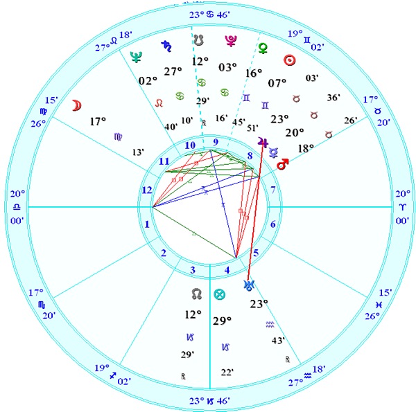 General Douglas McArthur was born on January 26, 1880 in Little Rock Arkansas, time unknown. His Aquarius Sun at 6 degrees squares his natal Neptune at 9 degrees of Taurus. His Mars at 22 degrees Taurus and his Pluto at 25 degrees of Taurus boxed in President Truman?s natal Sun and Neptune near those points. Truman didn?t like the General, and in all of their fixity, they locked horns and differed on how to conduct the war. Then McArthur made the unforgivable mistake of disagreeing in public with his Commander-in-Chief. It would seem that McArthur?s Sun-Neptune square made him somewhat delusional about who was really in charge of running things. This same square went on to form a T-square in the U. S. chart to Saturn and Mercury at 8 and 9 degrees of Scorpio respectively. His dangerous ideas about expanding the war and threatening to use the atomic bomb on China clashed badly with the ultimate authority figure (Saturn), in the U.S chart. Truman ultimately forced him to step down, and he retired.