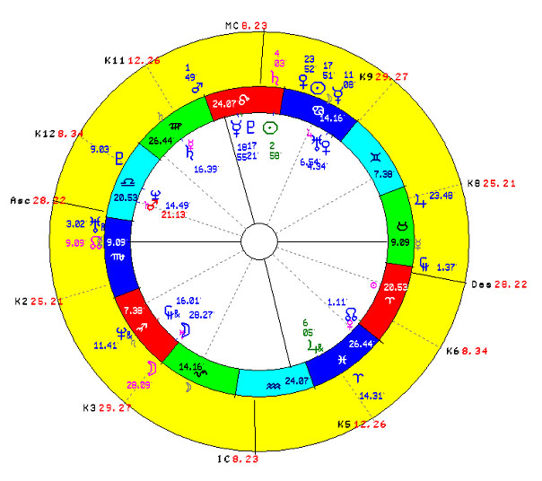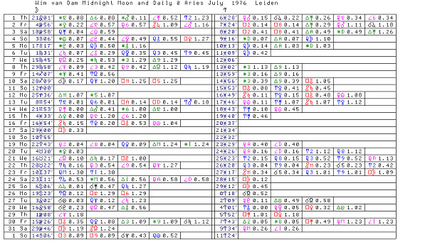 The above finding proved to be no coincidence: the moon's position at local midnight gives most valuable information. Now of course, I was lucky to use GMT 0-hours ephemeris, since 0 hours at Greenwich almost coincides with 0 hours in the whole of the Netherlands. It is not difficult to program this for any place in the world as a kind of calendar for a month. All aspects to the radix are sorted by orb, with the benevolent aspects colored green, the malevolent aspects red and the other ones blue or black (see the end of this article). As an example of the technique, below is my own horoscope, with the daily cusps on the outside circle, planets and the midnight moon for the day of my M.A. (slavonian linguistics), 9th of July 1976. This chart was produced from Morinus 2000: ![]() Shown above, Transiting Saturn (ruler of my third house and most applicable for the archaic Slavonian languages with their extensive declination- and flexion system), natural ruler of ten and radically positioned in ten conjunct to the radical sun, actual ruler of ten (all of which is most applicable). We see that both the daily axis 3 - 9 (languages, matters abroad) and the midnight moon are conjunct to the radical moon, ruler of nine. This of course is a very mighty combination, probably made even stronger by the sextile from the daily ascendant. I don't like using other aspects than the conjunction in daily horoscopes. One might also use the midpoint between transiting Mercury (languages) and the transiting sun (ruler of ten, radically in nine), which midpoint happens to fall exactly at the radical ninth cusp. Important: the influence of the midnight moon is sensible until about the moment the sun passes the upper meridian (the MC), from which moment, the moon's position of next midnight starts ruling. So its influence extends from midday the day before until midday next day. The ultimate boarder is not defined by the sun being on the MC but probably somewhere in the ninth house. This theory should be researched on a lager scale however. Like everywhere in astrology, there probably will prove to be no sharp clear-cut boarder that covers all cases. The midnight moon for my M.A., later in the afternoon, as given above therefore was not calculated for the 9th of July 0 hours but for July 10th. Possible misunderstanding: The above details can rise to serious misunderstandings. When I was to get married in 1986, my then fiancée, now my wife, called from Warszaw to ask me what Saturday in June would be most fitting. I consulted my ephemeris and a quick glance showed me that the 14th of June was the best date. The midnight moon was sextile to my radical Venus. Only later I found out that the wedding was to take place at 3:00 pm, which made the midnight moon of Sunday morning applicable. This moon was not only in a quintile to my Venus but also in conjunction to my Saturn and we have certainly noticed both influences. Have we covered all parts of the daily horoscope such as cusps, Sun, Moon and planets? Not quite. After so many trials and errors, I found another daily indication. In order to understand this, we now have to digress on primary directions (p.d.). In p.d.'s, all planetary points, cusps and planets, are progressed at about one degree a year whith each one having different speed (just like the ascendant moves by a half up two and a half degrees a year). In fact, with the use of p.d.'s, one can progress each point in the horoscope, even if it is empty. I soon found out that one can progress the point 0 Aries too, its aspects most often indicating a change or the start of something new in life. I started publishing on astrology when my primary 0 Aries was trine to radical Mercury (conjunct to Pluto) in nine. I started working in a real fixed job when it came in a trine to my MC. I would like to stress here that contrary to my expectations progressing the point 0 Cancer did not give any significant results. I was curious to see whether daily primary directions of the solar horoscope might give any interesting indications. What I mean is this: calculate the solar return, progress its MC at the Naibod measure in right ascension for each day, and calculate the corresponding primary directions and check their aspects to the radix (not to the solar return itself!). For some reason or another, the cusps and planets did not give much valuable information, but the aspects from 'daily' 0 Aries to the radix clearly did. For the day of my marriage, my daily 0 Aries had a position of 2 Aquarius, meaning its opposition point (analogous to 0 Libra and the descendant of course) was conjunct to my radical sun in nine. For the day I became a father, the midnight moon was at 3 Taurus - conjunct to that year's primary cusp 5 and in a square to the radical sun in Leo (5, sun and Leo all being related to children). A square to sun in Leo is of course a good aspect, the more so since radical cusp 5 is in a trine to the sun. Daily 0 Aries was in a tredecile to my moon - at first sight not so applicable, but 3 Taurus, primary cusp 5, happens to be the moon's degree of exaltation so cusp 5 was stressed by daily 0 Aries too. For the logic behind this see my 'Signs and Houses'. For the day of my M.A. I get 0 Aries at 14 Pisces - trine to my radical ninth cusp and sextile to cusp three and as we saw above the midnight moon was conjunct to cusp three. Both languages and study were stressed. My B.A. gave a midnight moon at 4.00 Aquarius, one degree from an opposition to my radical sun, and 0 Aries was at 3.31 Gemini (languages!), trine to my radical sun. So here the midnight moon and daily 0 Aries together formed a bridged opposition to the radix sun. For the day of my appendicitis-operation, the midnight moon was conjunct to my ascendant and 0 Aries exactly square to my radical Mars at cusp twelve. So the complete monthly table has to contain the daily positions for 0 Aries and might look something like the table below (table created from