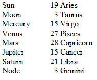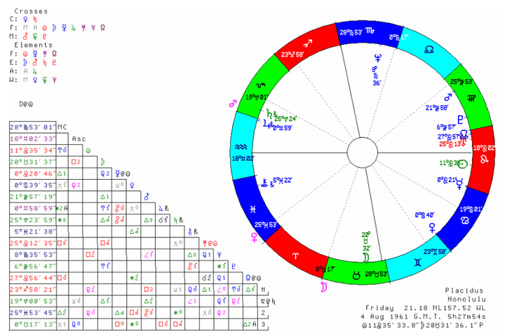 ON THE DEGREES OF EXALTATION & ON CRITICAL DEGREES Copyright © All Rights Reserved by Wim van Dam INRTODUCTION:In astrological tradition the sun, the moon, the five classical planets and the Northern Node are said to be exalted each in one sign. Sometimes they are even said to have their highest and purest influence when placed in this sign. Some authors however not only mention these signs of exaltation but also the degree within each sign that this exaltation presumably is associated with, thus: ![]() Mercury is the only planet that has got its exaltation in a sign that it rules too. Of these eight positions, six form an opposition in sign (although not in degrees) with another one: ![]() Leaving the moon and the node unpaired. Since the node's degree of exaltation is often not mentioned, this may be the reason why some authors in the past have allotted Uranus' exaltation to Scorpio, opposed to the "lonely" position of the moon in Taurus, thus completing the scheme to four pairs of opposed planets. One might also pair these degrees not by opposition of signs but by number of degrees: ![]() It is remarkable that the small benefic, Venus, has its exaltation in Pisces, traditionally ruled by the great benefic, Jupiter, while the small malefic Mars has its exaltation in Capricorn, ruled by the great malefic, Saturn. In the opposite signs, Virgo and Cancer, the two pairs have a weak position. TREATMENT OF THESE DEGREES IN LITERATUREMost authors do not mention these exaltation degrees at all, f.e. Hone (p. 144). Frawley mentions them in the table at p. 80 and on p. 79. He notes; "Exaltation is more exalted yet at the particular degree given for each planet", without mentioning any source or giving an example from his own practice. Morin on the very first page of chapter XXI of his Astrologia Gallica, without mentioning them, seems to implicitly discard them, together with other what he clearly thinks nonsensical stuff, although he is most certainly convinced of the value of exaltation in the signs. Wilson (p. 96) suggests they were added by more recent researchers ("astronomers") limited the effect of exaltation to degrees in stead of to whole signs. Lilly 1 (p. 57-99) only mentions the degree of exaltation of a few planets and on p. 102 in striking contradiction to Frawley he explicitly states that if a planet is in the sign of its exaltation it does not matter "whether he be neer the very degree of his exaltation yea or not." In Lily 2) even less information is given. When explaining exaltation Simmonite (p. 14) does not mention the degrees either, and so does Sepharial (p.17). Alan Leo (p.27) meticulously mentions them in a table but clearly is all alone at sea when he tries to find their significance. Several authors have tried to give an explanation for the distribution of these degrees amongst the zodiac. Since each of these explanations is rather convincing in its own but no more than any of the other ones we will not dwell upon them here. Also in this article we will not discuss the value of the planets in their respective signs of exaltation but take it for granted, as tradition says, that they have an outspoken positive value when positioned there in any degree and a negative one in the opposite sign, where it is in its fall. What matters here now is this question: do these traditional degrees of exaltation have any astrological significance? DEFINING OUR THESISIn this article I will defend the view that a planet that is in conjunction with another planet's degree of exaltation should be considered to be in conjunction to that planet itself, wherever that ruling planet is positioned in the horoscope. Of course, the planet's actual position does not lose its significance and should be carefully analyzed, but the virtual conjunction with the planet of exaltation is as important position in the horoscope and gives information that is otherwise unattainable. An orb of three degrees is allowed. A planet in its own degree of exaltation may be considered to be very strongly positioned but it is probably useless to speak of a conjunction with itself and I honestly wouldn't know how to evaluate the difference in quality between a planet in its own degree of exaltation and the same planet, 'only' in its sign of exaltation. Slightly different is the position of a cusp in a degree of exaltation. Here the best reading is mostly given not by projecting the cusp on the ruling planet but by projecting the planet on the cusp. The difference may seem trifling but I have found it really helpful to see it this way. The interpretation is simply the same as you would do if the planet really were in conjunction to this cusp, reckoning with both the significance of the cusp and of the ruling planet. The ascendant, as may be expected, shows the influence at its strongest. Examples: J.F. Kennedy and R.M. Nixon A nice illustration of this last remark is given by the horoscope of John F. Kennedy (degrees of exaltation indicated with pink glyphs outside the zodiacal circle wherever a radical point is conjunct to them): ![]() We see that the ascendant is in Saturn's degree of exaltation. Since Saturn is in its detriment (Cancer) in ten, we see here a general influence (a badly positioned Saturn in ten, meaning a huge fall in his career) made individual by the ascendant's degree. Please note the remarkable position of Chiron, in my view the real ruler of Libra, in Venus' degree of exaltation at the cusp of the sixth house. Thus the two rulers of the ascendant, both benefics, may be said to be in virtual conjunction, a sign of the native's popularity, but at the cusp of a malefic house, indicating a bad end. We will return to John F. Kennedy's horoscope further in this article but first we want to show an amazing similarity using the horoscope of his opponent, Richard M. Nixon: ![]() In this horoscope the fatal constellation is of course the conjunction of Mars, Mercury and Jupiter in four, opposed by Pluto. Of 