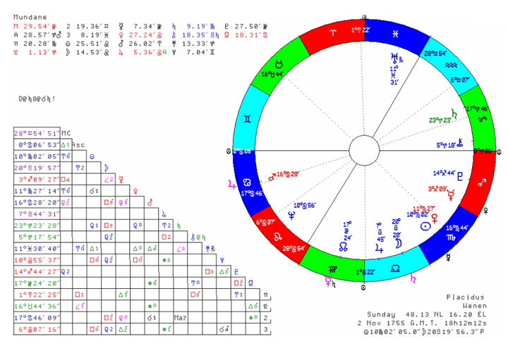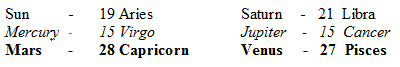 EXAMPLES OF CRITICAL DEGREESA) JOHN F. KENNEDY: We may now study once more the horoscope of John F. Kennedy (critical degrees indicated with small black glyphs outside the zodiacal circle wherever a radical point is conjunct to them). ![]() We see that the seemingly innocent square between the moon in 17 Virgo and Venus in 16 Gemini actually is positioned at two critical degrees that are both ruled by Saturn so that the malevolent significance of Saturn in Cancer in ten in this horoscope is also stressed by the rulers of the ascendant (Venus) and of the M.C. (the moon), rule #4. Saturn is positioned in a critical degree, ruled by Mars. This results in a Mars-Saturn conjunction in the tenth house in Cancer, the only sign where both are badly positioned (rule #5). Also, Mars' regular position is in its annihilation in Taurus, right on cusp eight, which makes the exaltation-conjunction with Saturn even worse (see the General Rule). Further, the moon is in Mercury's degree of exaltation: a direct reference by the ruler of the M.C. to Mercury's position on cusp eight. Mercury is in reception with Venus on cusp nine, which combination can be said to warn for lethal danger (eight) on a journey (nine). This is one of the few cases where I found reception informative, possibly by both planets being positioned on a cusp. B) HITLER: In Hitler's horoscope, ![]() Uranus in twelve conjunct to Saturn's degree of exaltation, which means we should see Uranus in ten conjunct to Saturn in Leo, the only sign where both are badly positioned. And of course Uranus, although projected into ten, still has got its ominous twelfth house color, a very bad indication. The sun is in the moon's degree of exaltation, making it "jump" to the conjunction of the moon and Jupiter in Capricorn, the only sign where both the moon and Jupiter are badly positioned. The sun itself is neutral in Capricorn, the tenth sign, but we should realize that it is the ruler of the tenth house and that mundane Saturn, natural ruler of ten and badly positioned in ten, also is conjunct to this moon-Jupiter conjunction. So what we see here is a conjunction of the moon, Jupiter and Saturn (natural ruler of ten and positioned in it, all three radically badly placed), in the tenth sign/house, together with the sun, ruler of ten. One can hardly imagine a worse constellation relating to a native's career. If we remember, as stated in the article on transgressional aspects, that within a conjunction of badly positioned planets these planets tend to worsen each other's bad influence. We see what an impressive constellation the stars once more built here, predicting the disastrous end of one of the worst careers in world history. More subtle but also highly remarkable is the position of the Libra-ascendant in a critical degree of Mars (rule #1). At first sight, knowing what we know about the native, we might conclude that this is someone, tending to break peace (Libra) by war (Mars), which in this context is no more than a truism. In the preceding article on mundane positions we saw that Hitler also had mundane Venus in the ascendant. Besides of what was stated there, we may now see the all-important significance of these two positions: the combination of mundane Venus and critical Mars in the ascendant, ruled by Venus, repeats and stresses the conjunction of radical Mars and Venus in Taurus, also ruled by Venus, thus making it highly individual. And yet we are still not at the end of our explorations of this horoscope. In The Mundane Equivalent we saw, that Venus in this horoscope had a mundane longitude of 26.14' Libra, very close to the ascendant, and we concluded that the position of the Mars-Venus conjunction in the seventh house was such that by transfer of light the whole conjunction had its mundane equivalent in the ascendant. This is not the whole truth however: the actual mundane position of Mars is 22.46 Libra - conjunct to Saturn's degree of exaltation. So the square formed by these two planets to Saturn is stressed individually by Mars' mundane position in Saturn's degree of exaltation. One may wonder whether such a position in a mundane degree of exaltation is as powerful as one in a regular, zodiacal one. I have found them almost as indicative but I certainly cannot say the same about mundane critical degrees. Probably they are too weak and if they had any influence, this would still be limited to the four rules defined above. C) MARIE ANTOINETTE: In the horoscope of Marie Antoinette, beheaded queen of France, ![]() The moon, ruler of the ascendant, in 20 Libra, Saturn's degree of exaltation, is a very bad indication, made personal by the moon being in a tredecile to the ascendant. This is technically a good aspect but the moon's situation is hopeless: in addition to its position in Saturn's exaltation, it receives at one side a square from its exaltation-ruler Saturn in Capricorn in eight and at the other side an even more malevolent square from Mars in its fall in the moon's own sign Cancer. So we have to explain this tredecile in a typical Morinic way, reckoning also with the moon's ruler Venus being in its detriment: the princess' initial position in life was splendid (youngest and favorite daughter of the emperor of Austria, married to the heir of the French throne and later queen) but it ended in a deep fall and finally a public beheading. Speaking in regular terms the opposition from Mars to Saturn is too wide, but it happens to be an excellent example of a rulership conjunction, for Saturn is in its own sign Capricorn and therefore conjunct to cusp eight (17.46 Capricorn) and therefore opposite to Mars at 16.28 Cancer on cusp two. Even without this rulership conjunction, the moon is in a T-square with both. Mars, the knife, in its fall, stands right on cusp two, i.e. in opposition to cusp eight that it is more related to by nature which is of course a very bad and most fitting indication for her death, to which may be added Satu