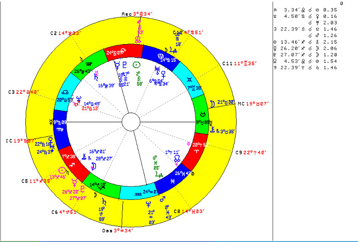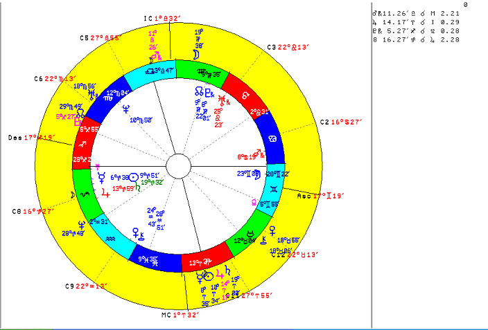 Copyright © 2007 All Rights Reserved by Wim van Dam It is an old tradition in astrology that signs and houses are somehow analogous to each other: the first house is analogous to the first sign, Aries, the second house to Taurus, etc. In this article I want to show that there is an even closer relationship between them than has generally been supposed and that this relationship can be used to make the horoscope a tool of far more precision. In order to prove our thesis, we will go further than stating that, for example, a planet in the fifth house has an identical influence to the same planet in the fifth sign, Leo. We will convert each planet's position in the houses, its position in mundo, to the same position in zodiaco, in the signs: if a planet happens to be positioned exactly halfway in the fifth house, we give it a zodiacal longitude of 15 Leo; if it is positioned at the very beginning of the tenth house, at the MC, it will get a longitude of 0 Capricorn and a planet exactly in the ascendant will get a longitude of 0 Aries. Thus a complete set of alternative, mundane longitudes for the sun, the moon, the planets, the node and other horoscopical points can be calculated. Experience teaches that most astrologers have little difficulty in understanding this planetary conversion from houses to signs. But the next step proves to be more complicated for many of our colleagues It is also quite possible to convert zodiacal cusps to mundane cusps, although at first sight this looks more like a trick. If, as our thesis says, signs are equivalent to houses, this means that also the beginning points of the houses, the cusps, are equivalent to the beginning points of the signs, 0 Aries, 0 Taurus, etc. This means that if in the horoscope point 0 Aries is positioned exactly halfway the fifth house, the mundane ascendant for that horoscope will be at 15 Leo. If the point 0 Gemini is positioned halfway in the tenth house, the mundane cusp three will be at 15 Capricorn, etc. Thus, besides of the sun, moon and planets, we may also calculate the mundane equivalent of the cusps which means we can calculate for each horoscope a complete mundane equivalent with all cusps and planets that is a complete horoscope in itself. Important information about mundane horoscope: if you calculate one and repeat the calculation for the same date and place but for four minutes later, you will see all positions, both the cusps and the planets, progressed backward by about one degree. This is not difficult to understand. Just realize that when the sun is at the ascendant it will have a mundane longitude of 0 degrees Aries equals 30 degrees Pisces. Roughly four minutes later it will have risen upward a little in the twelfth house and it will have a mundane longitude of about 29 Pisces. Then, four minutes later, it will have risen to a mundane longitude of 28 Pisces, etc. The same with the mundane cusps, they too progress backward at a speed of about one degree every four minutes of time. A little consideration will show that this horoscope shows a far more individual nature than the usual radix. As we have seen, roughly every four minutes not only its cusps' positions will progress backward by about one degree but also its planetary positions, a situation that we astrologers are not used to at all. Now you may suppose that the aim of this article is to promote the study of this mundane horoscope, to be calculated for each regular radix, and to show how far superior are the indications furnished by this horoscope, and how more exact and applicable are its results, just like proponents of midpoints, harmonics etc. have done in the past. On the contrary, never will I! For me, the traditional horoscope is the root, the natural object of all analysis, progressions and whatever treatment you want to apply on it. In the same way, I do not think we should consider the mundane equivalent as a more personal, more refined horoscope that should be interpreted on its own. We should always compare it to the radix by means of whatever conjunctions happen to be made between the mundane positions and the radical ones. Under certain conditions, I have even found an orb of more than three degrees acceptable.