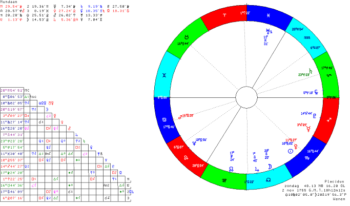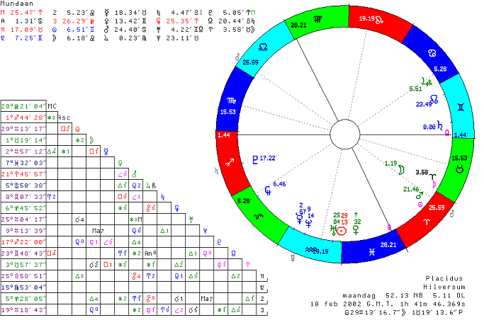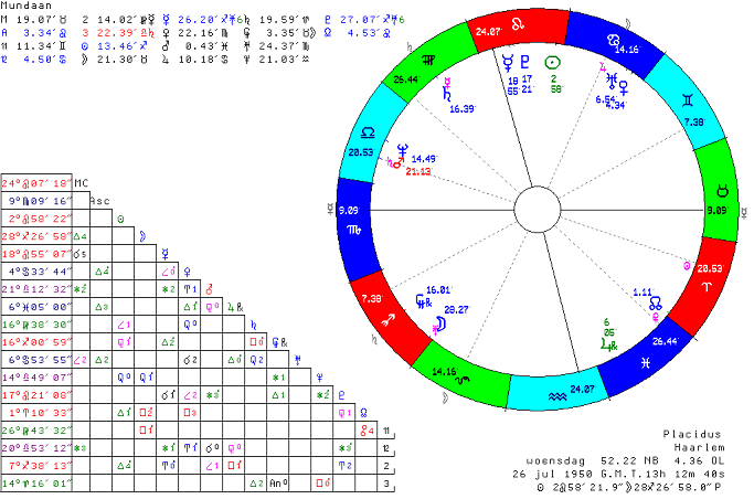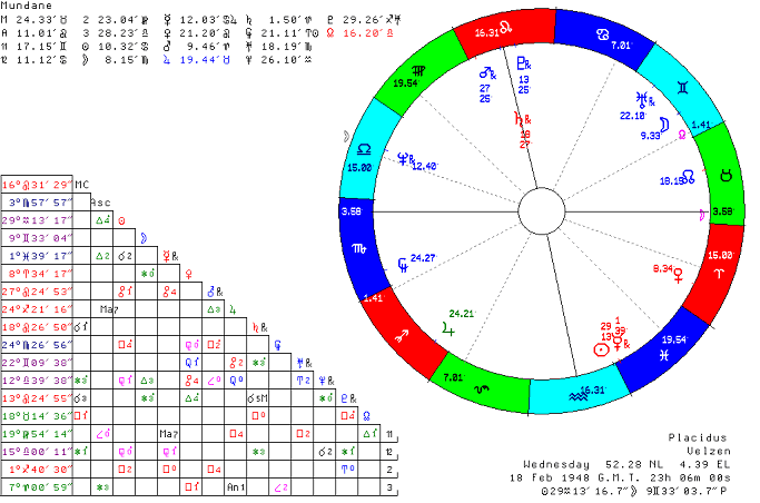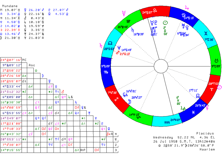Throughout his school career Jan was a very intelligent boy, who at school excelled in and later quite successfully studied mathematics. Once our teacher of mathematics told his parents how she feared Jan, 14 years old, raising his finger for then she invariably thought 'Good Heavens, where did I go wrong this time ?' What indications, presumably concerning Mercury and its houses and signs do we find for this intelligence? Traditional ones are: the exact trine between the Moon and Mercury, part of a transgressional grand trine with Mars in three, Mercury being in Capricorn, the sign of Saturn (mathematics). The moon is in a tredecile to cusp three, thus linking the grand trine to this cusp. With the tools used in this article we see Mercury's degree of exaltation on cusp three. Could we think of a better, a more natural place? This is a perfect example of the principle that the general zodiacal (here 15 Virgo) should be in agreement with the particular mundane (here cusp three.) In addition to this, on the cusp of the third house we not only find Saturn itself, but the cusps three and nine are in Saturn's critical degrees too. It is of course this repeated influence of Saturn in combination with Mercury that directed his intelligence towards mathematics. The most astonishing features however are the conjunctions of mundane cusp three with radical Mercury and, the other way round, of mundane Mercury with radical cusp three. Such a double reciprocal indication is very rare and it stresses once more the value of cusp three and Mercury in this horoscope. Note that mundane Mercury is not only conjunct to regular cusp three but also to Saturn. This cusp three provides us with an impressive mixture of Mercury and Saturn. Very nice in the light of this article is the tredecile, a house-sign relation, between Neptune (ruler of nine, study) and the natural ruler of nine, Jupiter But the most striking interaction we found is the one between cusp three and Mercury: Mercury is both natural and actual ruler of three and ruler by exaltation and has got a double mundane conjunction with cusp three. Mercury is also stressed by its critical degrees being on the axis ascendant-descendant. Once more, for an important fact in life we see that there is an interplay between the planet involved (Mercury), the occupation of the house it rules (three) and the cusp of this house. Gemini is not involved but Mercury's other sign, Virgo, certainly is (I do think Virgo is more characteristic for mathematics than Gemini, that I link more to languages). And just like with the preceding horoscope, we find cusp three the main indicator for intelligence. As we say in science, more research is needed here. There is a bad side of this Mercury too: it is placed in Mars' degree of exaltation, Mars being weak in Libra, and the moon that makes a trine to it is ruler of the twelfth house. Since Mercury is placed in the sixth house and the sun, ruler of the ascendant, is on the cusp of six, I suppose this relates to the hereditary disease in his family that caused the death of two elder brothers soon after birth, probably indicated by the square between weak Mars in three (brethren) and Uranus, ruler of eight. Jan himself was only slightly touched by this disease (thanks to the tredecile between the sun in the sixth house and its ruler Saturn in the sixth sign, a positive house-sign relationship, reinforced by the sun's position in Capricorn ?). Since the IC is in the exaltation degree of Saturn, ruler of six, it is highly seductive to see a relationship between the sixth house, diseases, ruled by Saturn, and the IC, heredity. It is interesting how the very same trine between Mercury in the degree of Mars' exaltation in the sixth house and Mars in the third house at one side probably favourably influenced the native's intelligence and at the other side indicates a serious disease in his family. At present I don't know how to propose a rule that comprises and discerns between both meanings, good and bad. The reason why I publish these two horoscopes is that they show once more De Luce's Golden Rule that for hard facts in life more than one indication is necessary. So often I hear that I use too many tools to show a fact of life from a horoscope: "but Wim, don't you see this or that indication suffices, you really don't need all these other ones." My answer is that I DO need more than one indication, some of them general some of them particular, whether they are provided by purely traditional indications or by the more advanced tools I had the honor to show to you in this and in the preceding articles. Final remark: References: