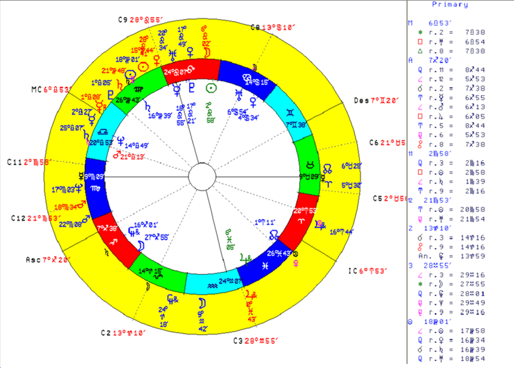The General and Particular Copyright © 2007 All Rights Reserved by Wim van DamINTRODUCTIONIn this article I want to discuss what is probably the most vexing problem in astrology, and that is: How to tackle a horoscope, especially a blind one, and to reach clear (not vague but specific) results with a high percentage of probability. The problem is known under several names ("at present our knowledge of astrology is comparable to knowing only words of a language and not knowing how to choose them or to compose sentences", to paraphrase James Holden's Word-problem, or "one can interpret the parts of a horoscope in so many different ways that one cannot choose", Rob Hand's poly-interpretability problem, as I prefer to call it). The problem is even more complicated than it seems at first sight. Not only don't we know how to interpret a planet's position in a house, we even don't know whether its influence will make itself clear by the house position or by the house it rules or by a house (if any) whose cusp is strongly aspected by it or all of the above. USE OF ASTROLOGY HANDBOOK FOR CHART ANALYSISMost astrologers in practice think they have a simple solution by consulting their favourite astrology handbook of that moment for each planet's position in sign and in house and trying to render the found text in an acceptable way and the same for each planetary aspect. This usually does not give any interesting result at all. The reason is that this method implicitly assumes that each horoscopic indication relates to one fixed interpretation that can be rendered in for example, half a page of text. Simple pondering shows this is impossible. Each position of a planet in a sign takes some days or even several years and one really can't assume that this means any one born during this period will experience the same facts and/or events in life. House positions do not help much either: Therefore, even if one writes a textbook with 144 descriptions for each individual planet (12 signs multiplied by 12 houses) this would not really help much. In fact, this number of 144 interpretations should be multiplied by 12 again, for each planet can rule at least one of the twelve houses and cast aspects to any cusp. Doing so however, we still would not have a reliable textbook. Usually, if the horoscope of a well-know person is analysed, the astrologer does not have any problem in explaining every fact that he/she knows about the native's life: for every desired fact he/she will easily find a fitting indication. But here the problem is, it will not be difficult to find other horoscopes with the same positions/aspects/midpoints that do not relate to similar facts in life. The reverse also holds well; in practice almost any aspect is or can be used to explain any fact of life. And be honest: did you never make the mistake of stating something right from a wrong indication, for example from an aspect that on second thought proved to be no aspect at all? Well, I did. The analysis can either be wrong or it is right. If it is right and not vague or applicable to anyone (which is not the same!) is it then true for anyone with this indication? If your answer is, "But look how satisfied my clients are!", you should realize how satisfied people were with their physicians at a time, some ages ago, when these physicians really knew nothing. This is the sad history of phrenology that Dean likes so much to mock with. True, the late Hague astrologer Jan Gieles, who taught me traditionalism, could sometimes give breathtaking details on a native's past or future but he himself stated repeatedly he was more of a clairvoyant. He also could not teach this specific knowledge to his pupils (including me), no matter how much he tried to teach and his students tried to understand him. The number of possible readings is too large (poly-interpretability): We all share the same experience: Even the most extensive textbooks cannot give a reliable solution. The best approach would seem to have a limited set of keywords for each indication and to apply them differently according to all indications as a whole. The only author I know that succeeded more or less in doing so was Margaret Hone in her two superb books. Although she is not a very popular author, I think her books can be considered a splendid introduction to astrology. After that, one should go further to advance in astrology, but where? Good question. Certainly not by consulting one of the many recipe books that are currently in the market and that some astrologers cherish as their magic incantation books. Another way of escaping from this dilemma is the use of midpoints. But they are even stricter in their reading, and therefore even less useful. (In one of the handbooks of the Hamburg School one can read the serious advise: "collect all indications, look for the applicable ones and throw away the other ones. ..") One reasonable way would seem to advise using only the planets that are conjunct with or in aspect to the cusps, for they tend to be more personal and outspoken. This may be true, but