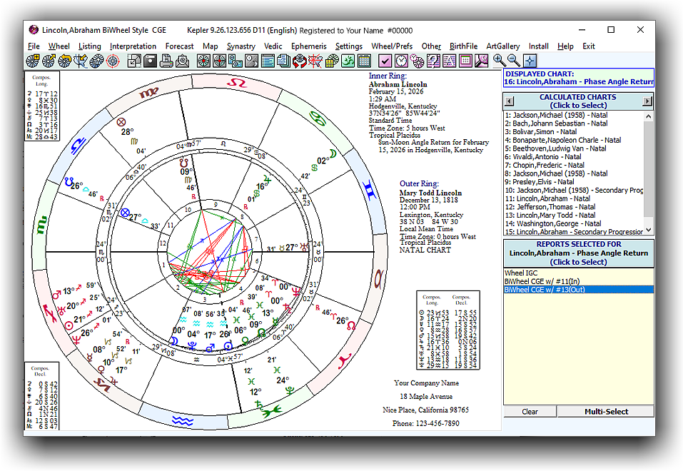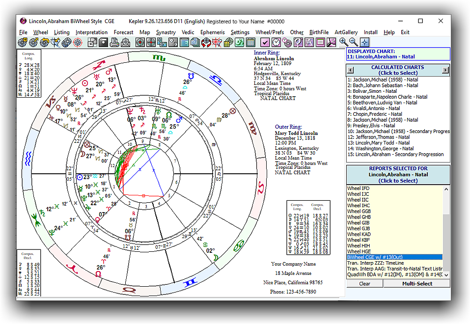 Many astrologers analyze a chart wheel with multiple rings and in the rings there may be a natal chart, a progressed chart, transits, and another kind of progressed chart or directed chart, or a solar return or other kind of chart. There are many variations of these chart wheels and kinds of progressions and returns. Described below are many of these features that are available in Kepler, and we describe the features in three sections: