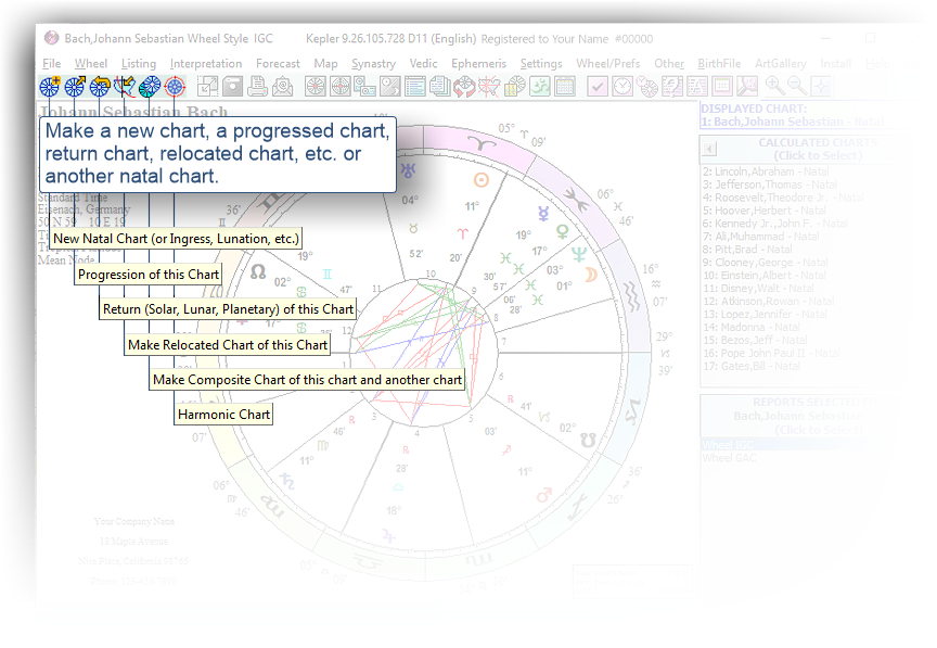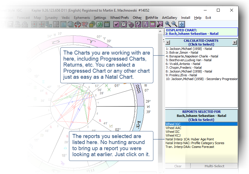 Reports Selected Are Easily Available! Many astrologers look at many charts and reports. You may wish to see an AstroMap, and then a forecast, a progressed chart, a composite chart, and then you may wish to see the same AstroMap for another person, etc. In Kepler you quickly jump to the information you want with a few mouse clicks.