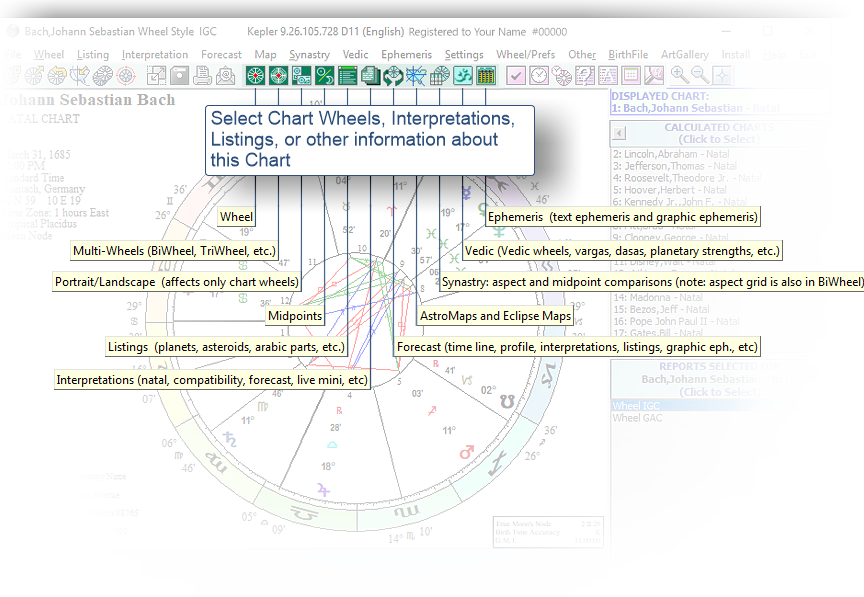 Kepler is an extraordinarily powerful program with and endless number of features. We have carefully crafted every part of the user interface to enable you to get the information you want in a smooth and intuitive manner. Many programs allow you to do the basics of pulling up a chart with ease. But suppose you want to do something creative like look at the midpoint structures formed between a solar return and a natal chart or a harmonic chart of a composite chart. Even if your approach to astrology is simple or you are a beginner, when the day comes when you want to explore a new idea or step outside the basics, you will be glad that you have Kepler. It all starts with the color-coded icons at the top of the main window. Click on the thumbnails for full screen shotBlue Icons: Make a new chart. A progression, solar return, composite chart, relocated chart, and harmonic chart, for example, give you a new set of planetary positions. Make new charts with the blue icons. Green Icons: Select chart wheels, interpretations, listings. Here you select whatever information you want about this chart, whether it is a wheel, interpretation, table, listing, etc.