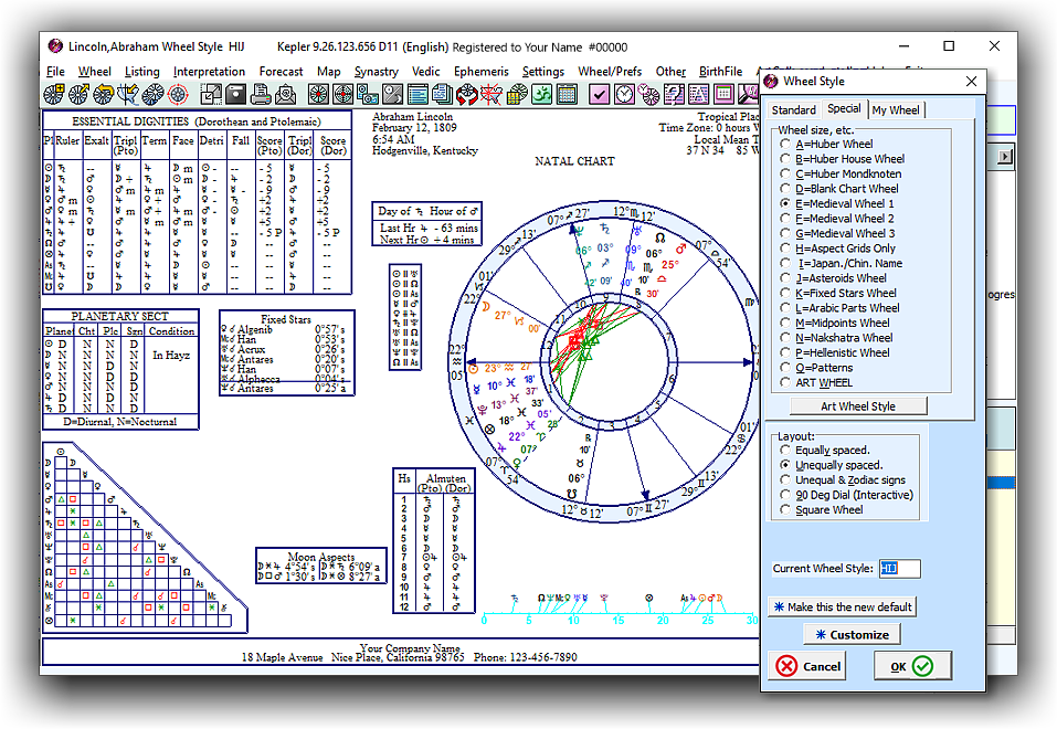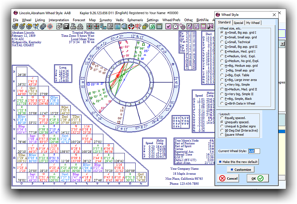 Astrologers and students of astrology often spend a lot of time looking at chart wheels. Some of us want zodiac signs around the outside of the wheel, we may want the planet glyphs a particular size or color, we may want an aspect grid or other information, we may want to add particular asteroids, etc. The list of preferences is very long. Kepler provides you