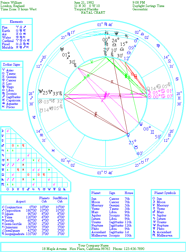 Prince William's Natal Chart: Chart Wheel Style "Simple White"