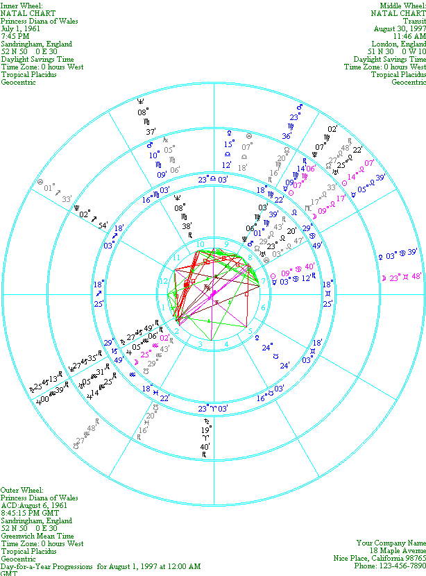 TriWheel: Princess Diana in the Inner Wheel, August Transit in the Middle Wheel, Progressed Chart in the Outer Wheel
